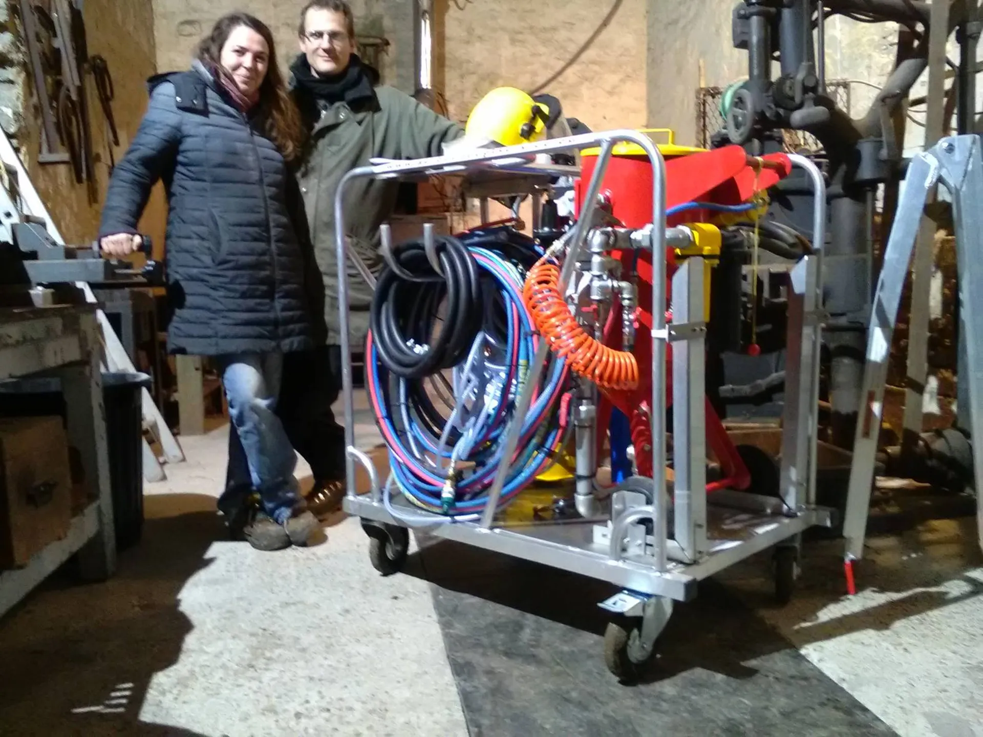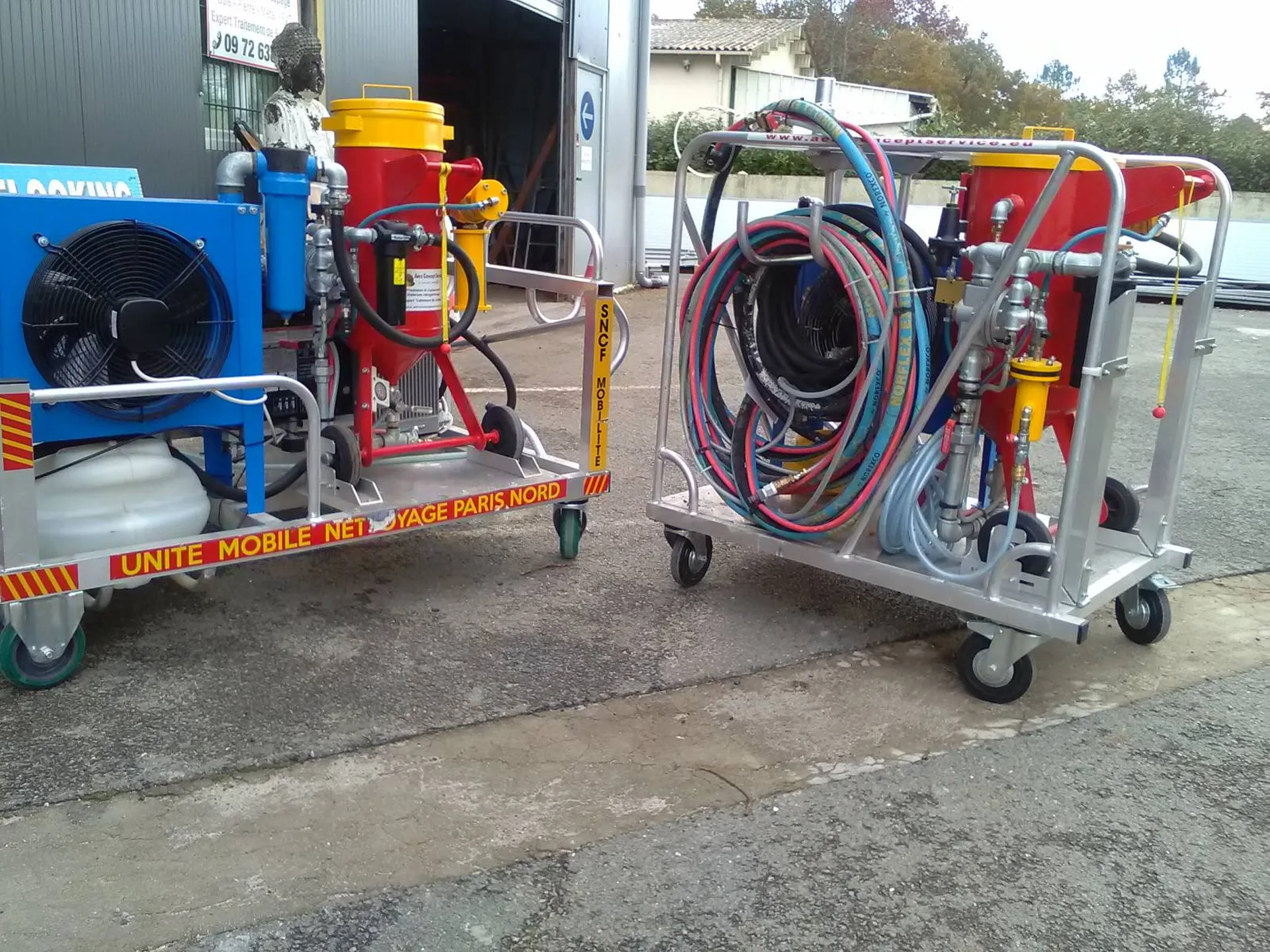 Le skid aérogommage ou hydrommage, notre équipement complet posé à des dimensions passe partout avec 4 roues et se rentre partout!