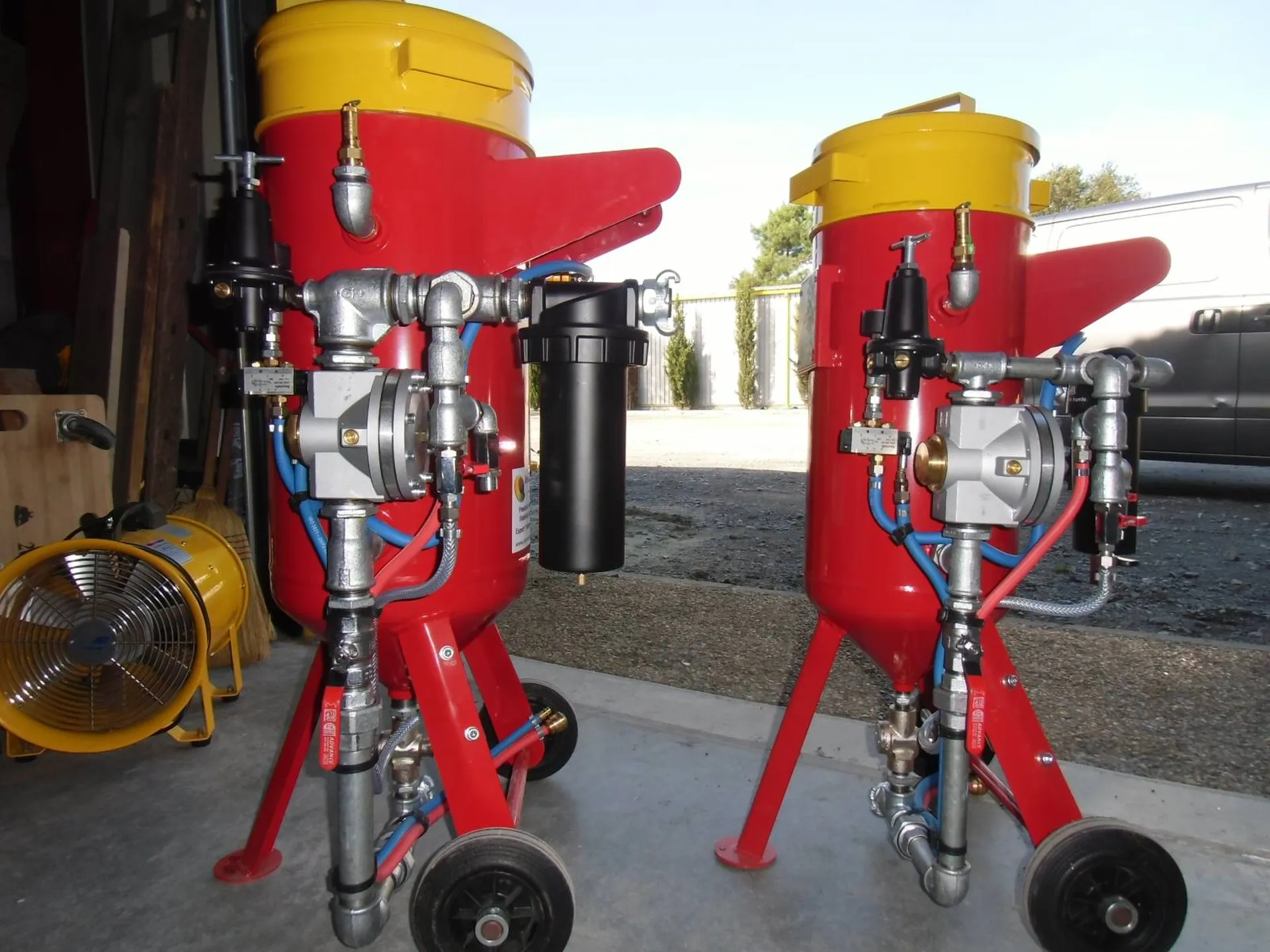 C montée avec un bloc de compression et décompression, visible sur le haut de la cuve, qui garantit un arrêt immédiat de l'abrasif et une coupure nette de l'air fourni par le compresseur.