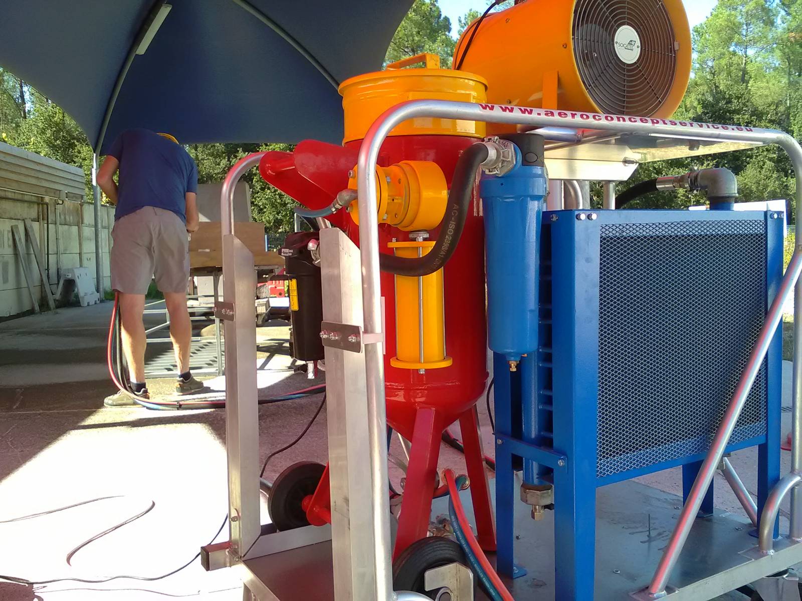 ce qui change notre aérogommeuse en version hydrogommeuse, c'est un montage un système posé sur la tuyauterie de sablage qui vous donnera un apport d'eau utilisé simultanément au travail de décapage brumisé.