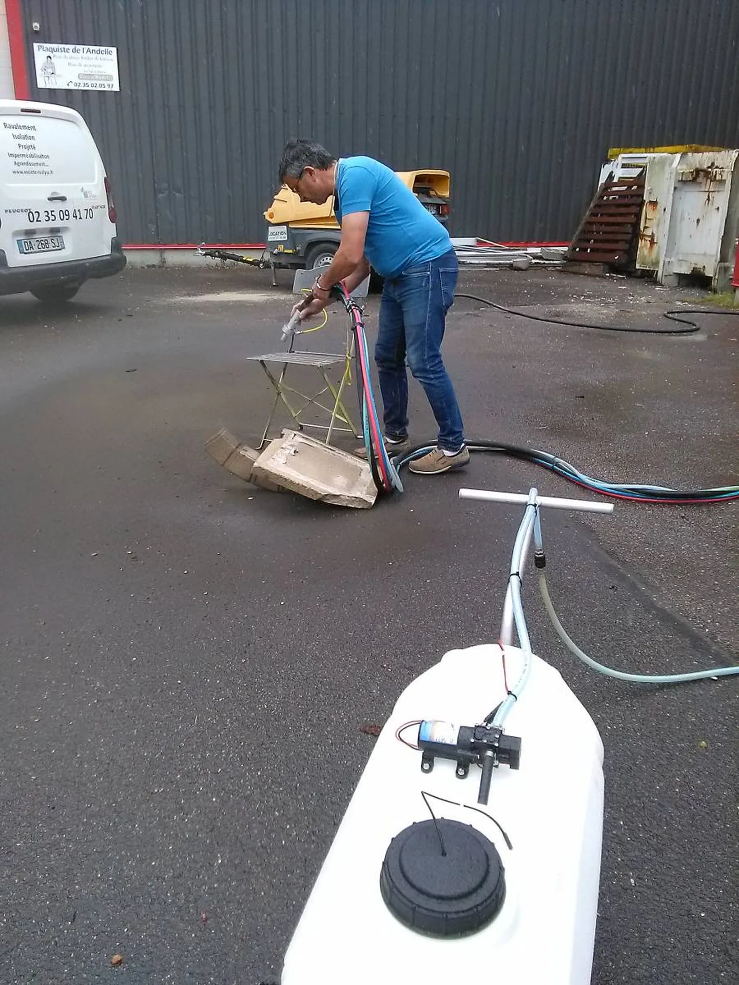 A la buse hydrogommage d'aéro concept service va aspirer l'eau , ensuite la répartir pour la diffuser en même temps, à la même puissance que l’abrasif et l'air, mais en micro gouttelettes!