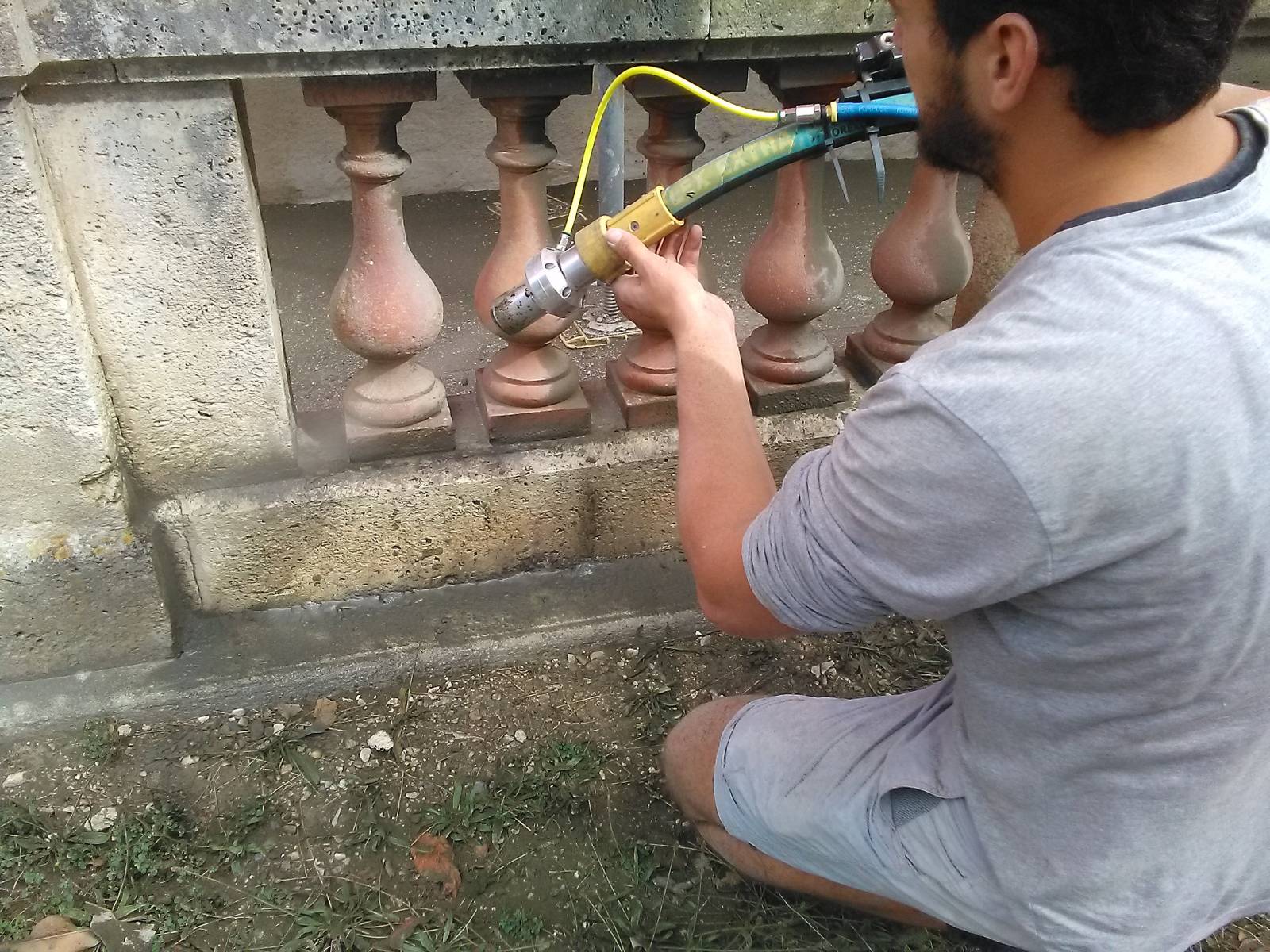 A la buse hydrogommage d'aéro concept service va aspirer l'eau , ensuite la répartir pour la diffuser en même temps, à la même puissance que l’abrasif et l'air, mais en micro gouttelettes!