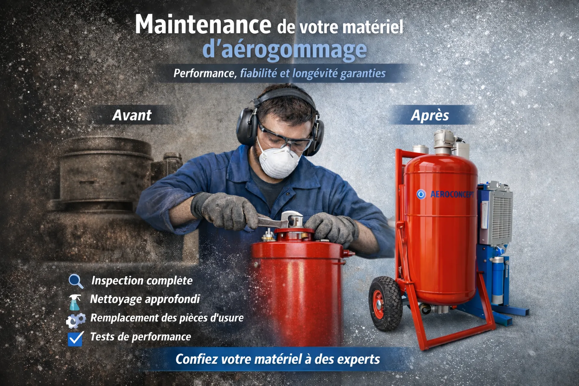 Votre matériel d'aérogommage est un équipement qui demande un entretien régulier. Chez AEROCONCEPT, nous comprenons l'importance d'un équipement fiable et performant. C'est pourquoi nous proposons une gamme complète de services de maintenance pour vos aérogommeuses, compresseurs, sableuses… afin de garantir leur bon fonctionnement et de prolonger leur durée de vie, qu'il s'agisse de matériel AEROCONCEPT ou du matériel d'un confrère.