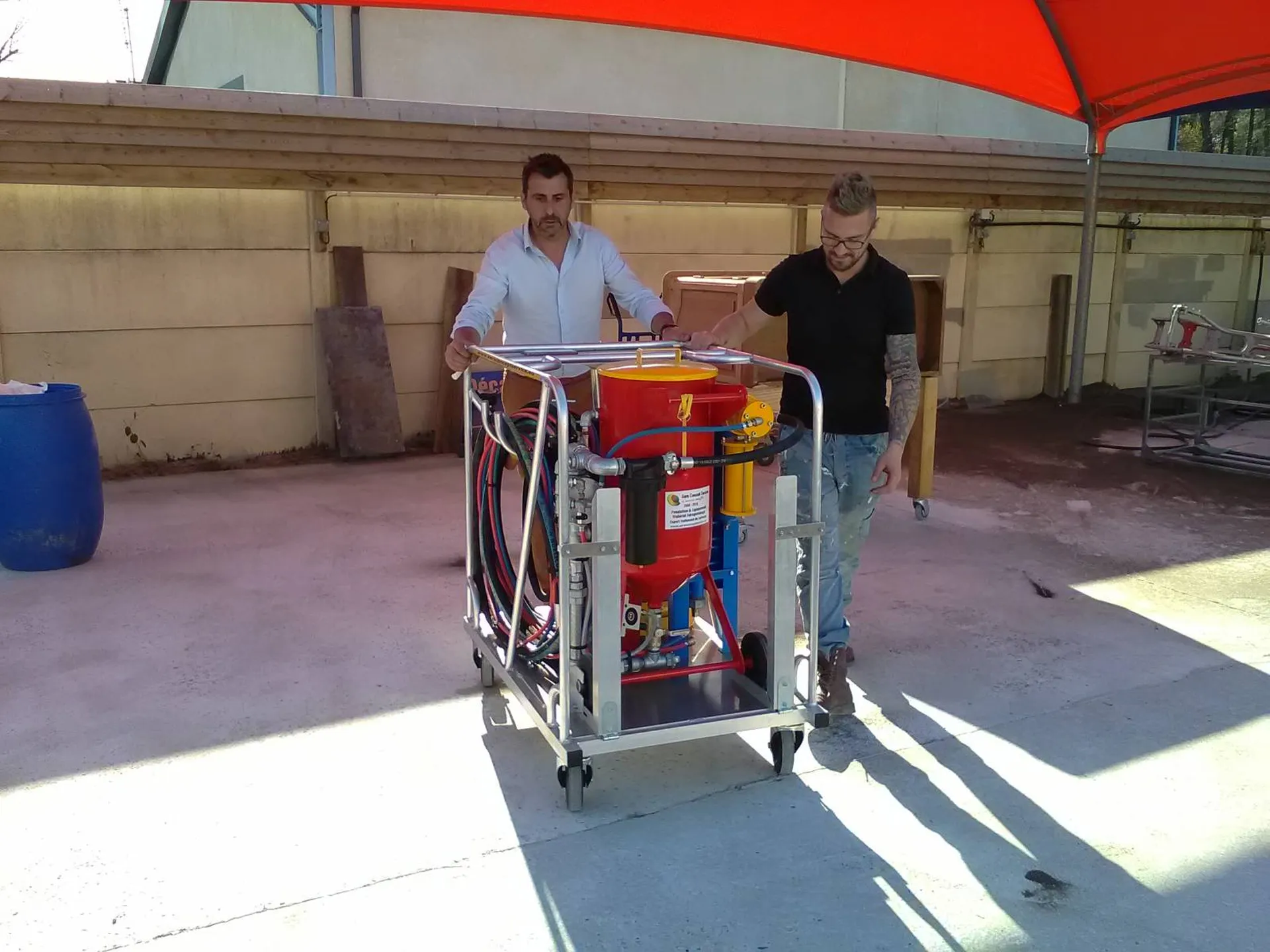 Nous voulions surtout donner la liberté de manœuvrer et d'enlever l'aérogommeuse du chariot à tous moments si nécessaire et selon une configuration de chantier de décapage.