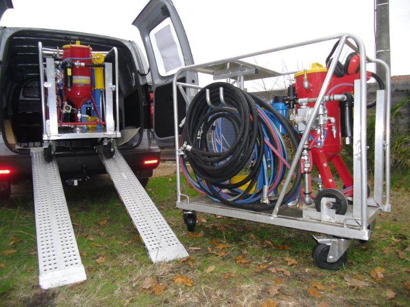 Le skid aérogommage ou hydrommage, équipement complet posé sur un chariot aluminium libératoire est un passe partout avec 4 roues directionnelles