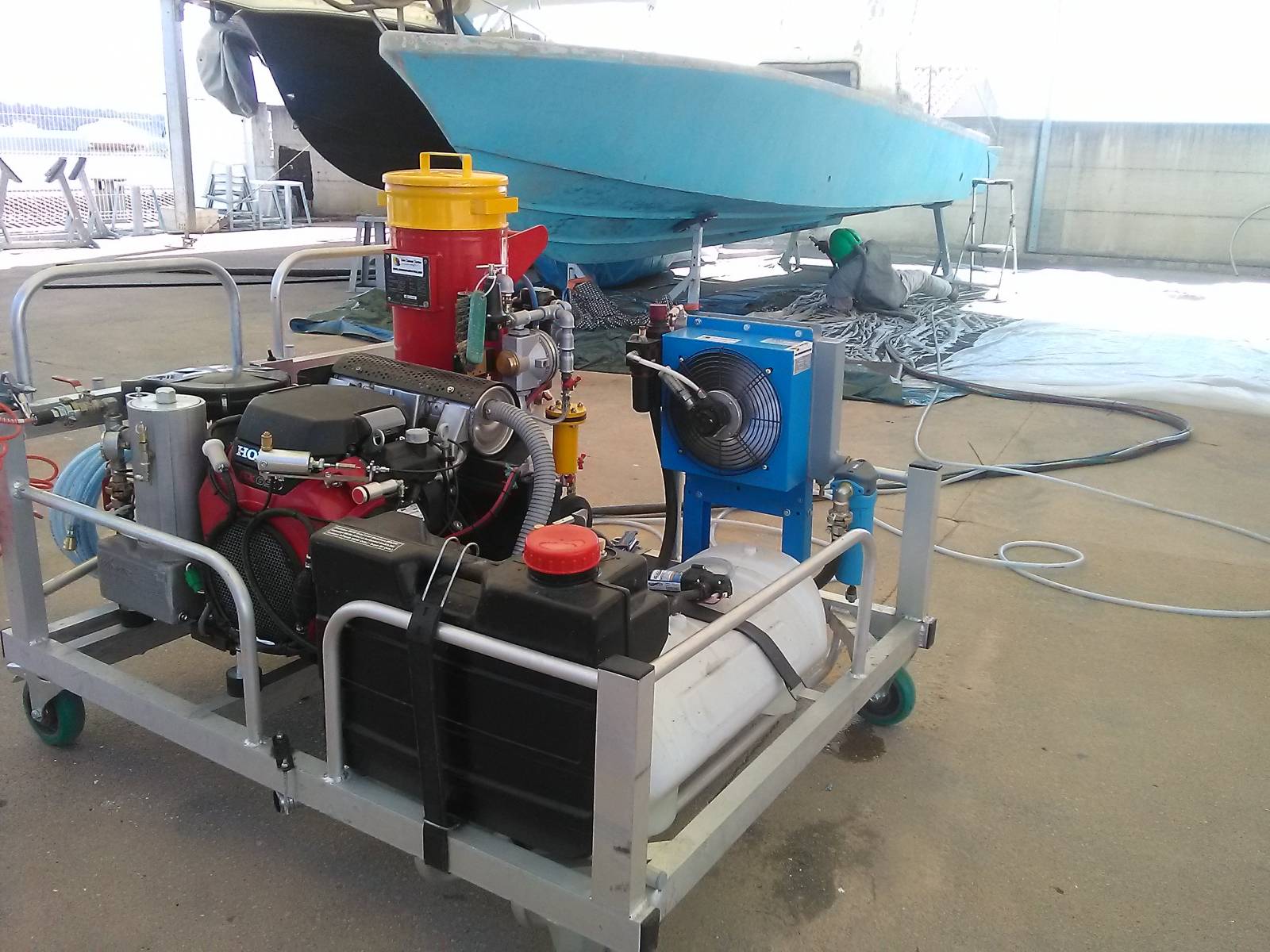 aérogommeuse et le compresseur vis en marche.