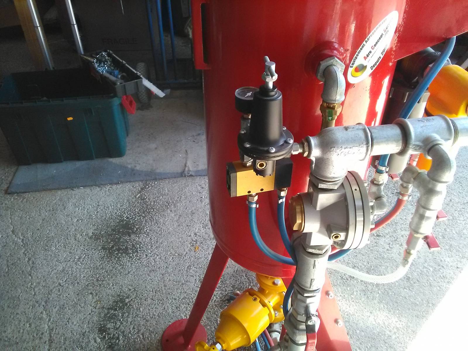 Ainsi avant le sablage la mise sous pression de la cuve se fait manuellement par une manette extérieure présente à droite de notre aérogommeuse!