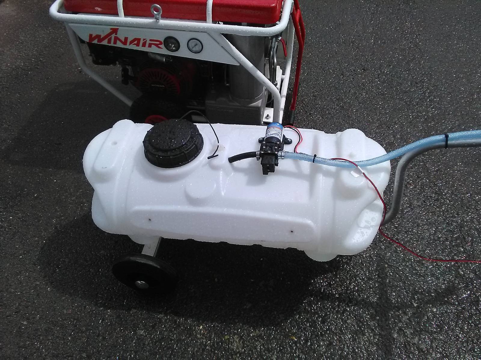 Réserve eau 70 L indépendante posée sur chariot aluminium monté sur deux roues avec pompe afin de vous permettre sans aucun souci de vous alimenter jusqu'à 30 M de votre unité mobile